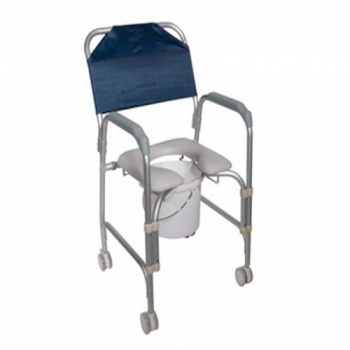 Knock-Down * Easily assembles without tools * 3 Non-skid rust resistant swivel casters (2 rear locking) * Anodized aluminum frame * Back removes for easy cleaning (tool free) * Comes with removable 12 qt. commode bucket and cover * Plastic armrests * Padded open front vinyl toilet seat * Limited Lifetime Warranty * Overall width: 21« * Width between arms: 18 * Seat width: 16 * Height: 21 * Product weight: 14.1 lbs * 4