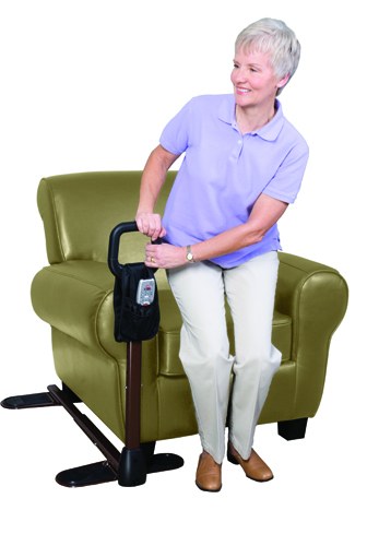 Ergonomic safety handle-Makes standing & sitting easy and safe * Saddle bag pouch-Four pockets keep convenient items close by * Adaptable-Adjusts in length and height to fit either side of your favorite couch or chair * Works great with a lift chair * Super grip rubber pads-Ensure stability and protect floor from damage * Fits couch feet distance: 21 to 33 * Cane height: Adjustable from 29 to 32 * Width of handle: 15 * Weight capacity: 300 Lbs *
