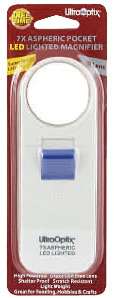 Pocket-sized optical quality 7x magnifier * Features an unbreakable scratch-resistant 1-1/2 lens * LED lighted for brilliant light * Requires 3 AAA batteries (not included)