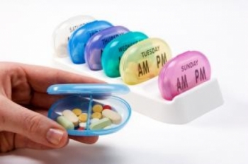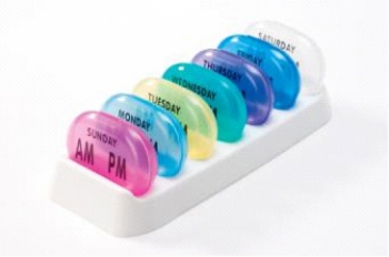 Daily AM/PM pill boxes * Daily or weekly medication planning * Seven daily pill boxes each has two compartments with snap close lids * White base with assorted inserts available in translucent clear blue light blue berry purple green or yellow color *