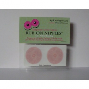 Rub-On Nipples® are temporary areola tattoos that last one to two weeks and are easily removed with rubbing alcohol. They look amazingly similar to three-dimensional permanent areola pigmentation, commonly called nipple tattoos. They can last one to two weeks, depending on many factors including your lifestyle, activities, and even the weather.