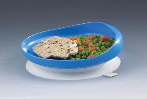 Plate * High rim and reverse curve on one side aid in scooping food onto a utensil without spilling over the side * Plate measures 6 3/4 in diameter * Dishwasher safe (bowl and plate only not suction cup) *