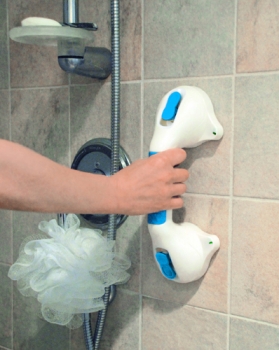 * Get in and out of the bathtub safer & easier than ever before when you need a little extra help this hand bar attaches instantly to shower wall or tub with super-strong suction cups preventing dangerous falls * Easy-release flip-up tabs let you reposition the handle or remove it * Sturdy construction provides extra stability and requires no drilling of holes or screws for installation * Also includes RED/GREEN color indicator buttons so you can tell at a glance if you have a secure suction